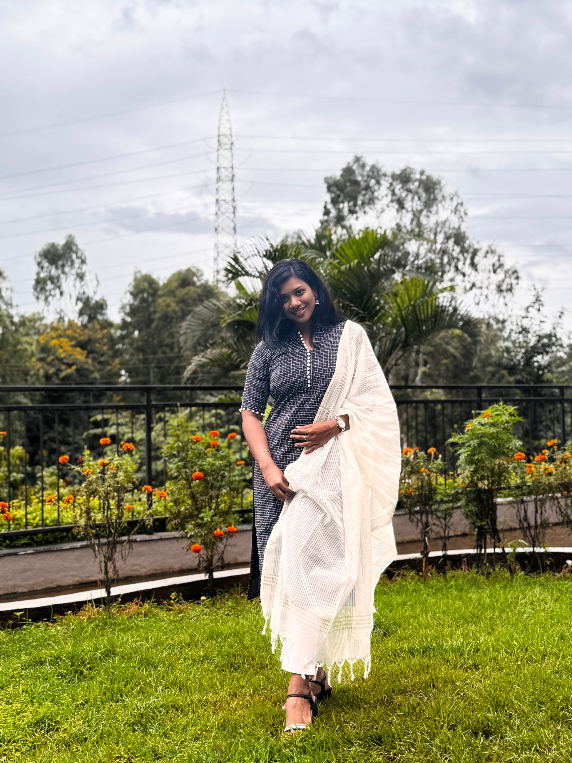 Add timeless elegance to your wardrobe with this pure handloom cotton salwar set, featuring a black kurta with potli button neckline detailing, a crisp white dupatta, and matching straight pants. Designed in breathable handloom cotton, this set offers comfort, sophistication, and versatility for everyday wear.
