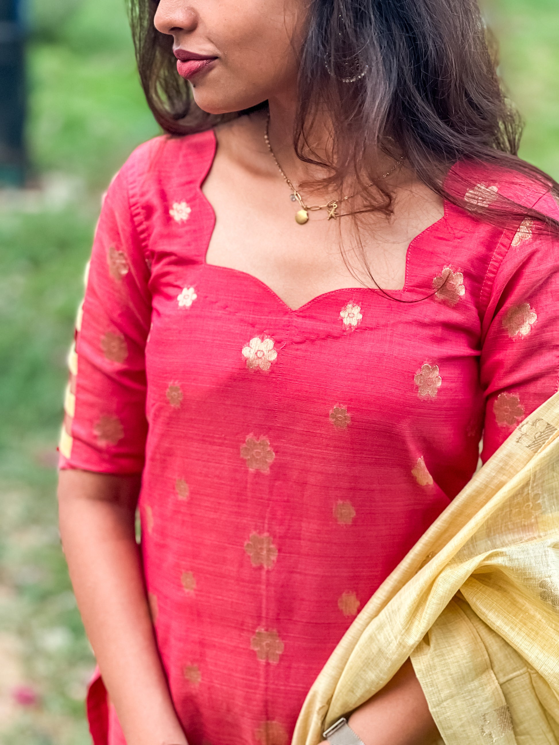 Elevate your ethnic wardrobe with this elegant Red Chanderi Kurta with Gold Dupatta, crafted in Chanderi silk for a luxurious feel. The kurta features a striking floral butta pattern and adds a touch of shimmer and sophistication. The neckline is beautifully detailed with potli balls, enhancing its festive appeal.