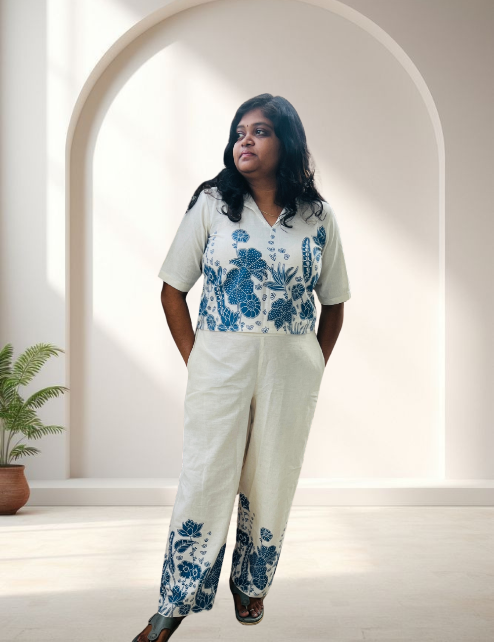 Elevate your casual style with our Pure Cotton White & Blue Printed Co-ord Set – a chic, comfortable outfit perfect for brunch dates, vacations, and relaxed outings. The set includes a breezy short-sleeve shirt with elegant blue floral prints and matching wide-leg pants adorned with coordinating prints at the hem.
